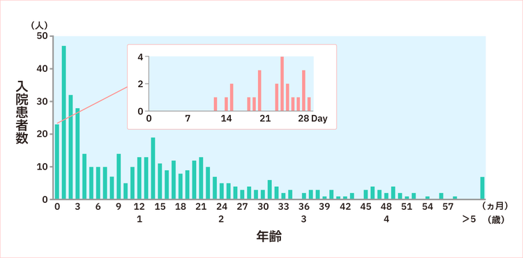 2016年4月~2017年3月、長野県内の11病院にRSウイルス感染症により入院したお子さんの年齢を調べたところ、生後1歳未満が全体の50.4%で、最年少は生後12日でした。